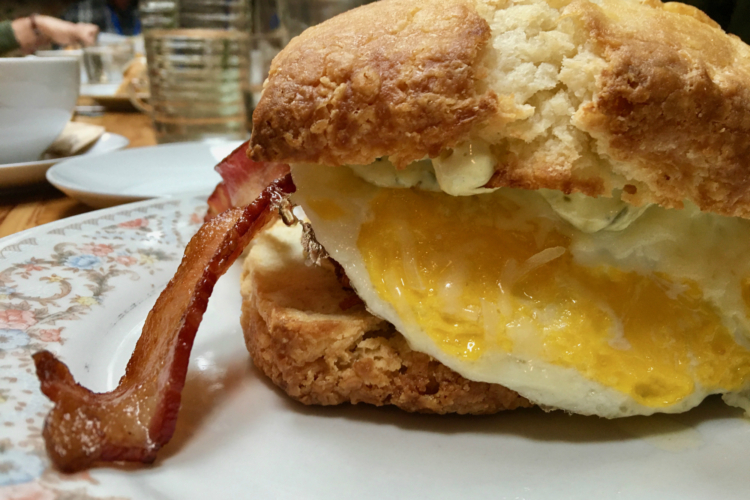 The next day in the private dining room at Ambrose & Eve, my Mountaineer is a buttermilk biscuit sandwich (get out the gluten pills) filled with eggs, a hashbrown, bacon and a mayonnaise-style cold-egg sauce—all insanely good. I vow to return another day for the fish and grits and/or the salmon-caviar omelette.